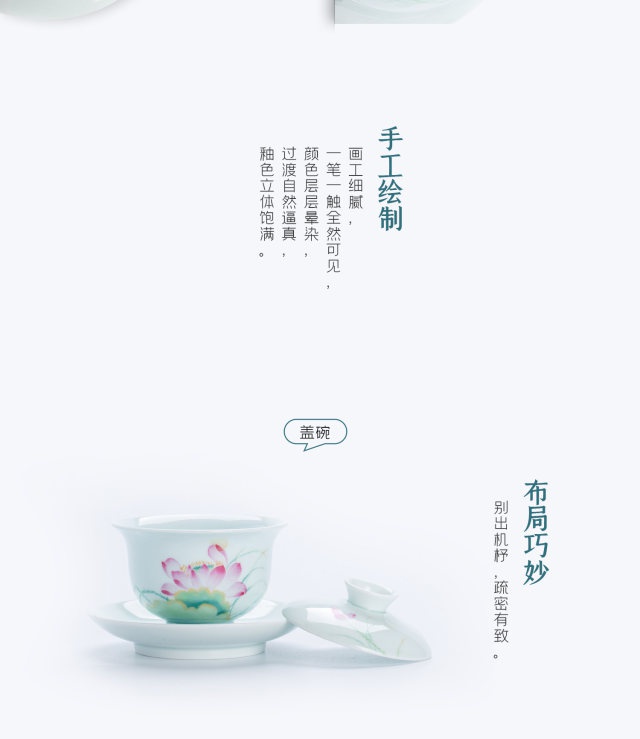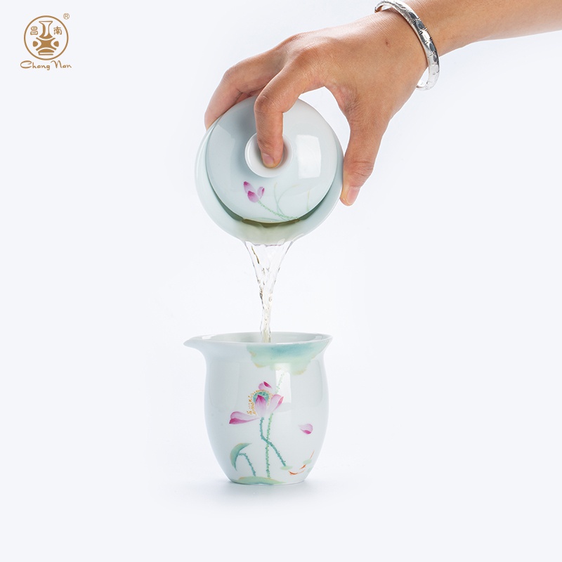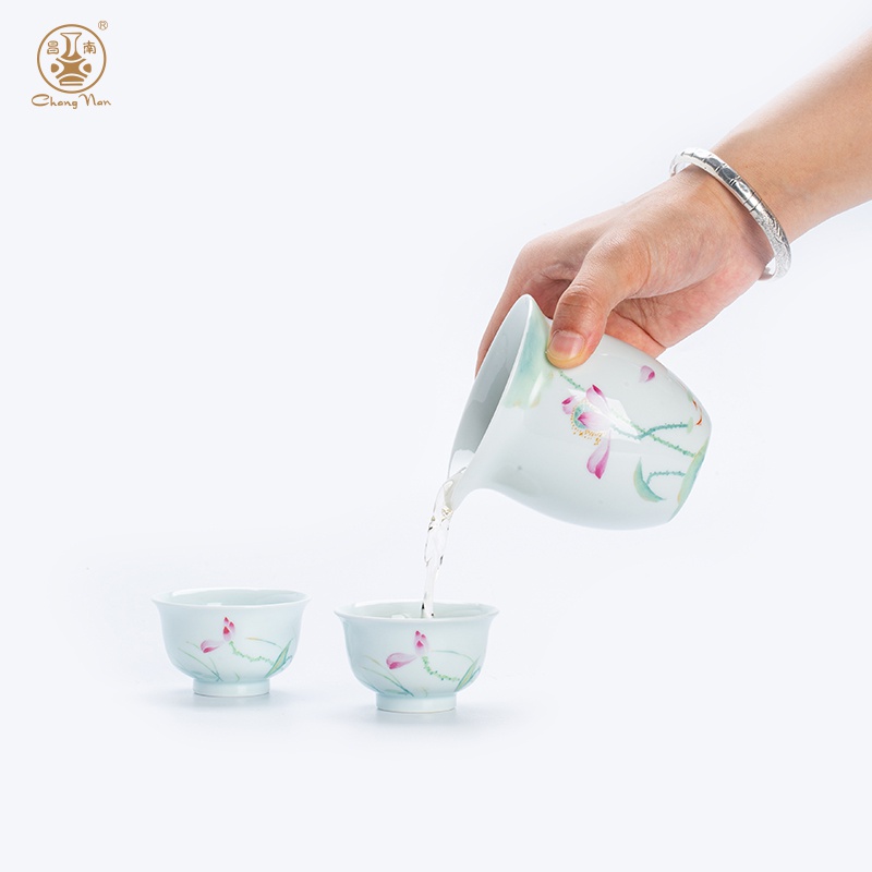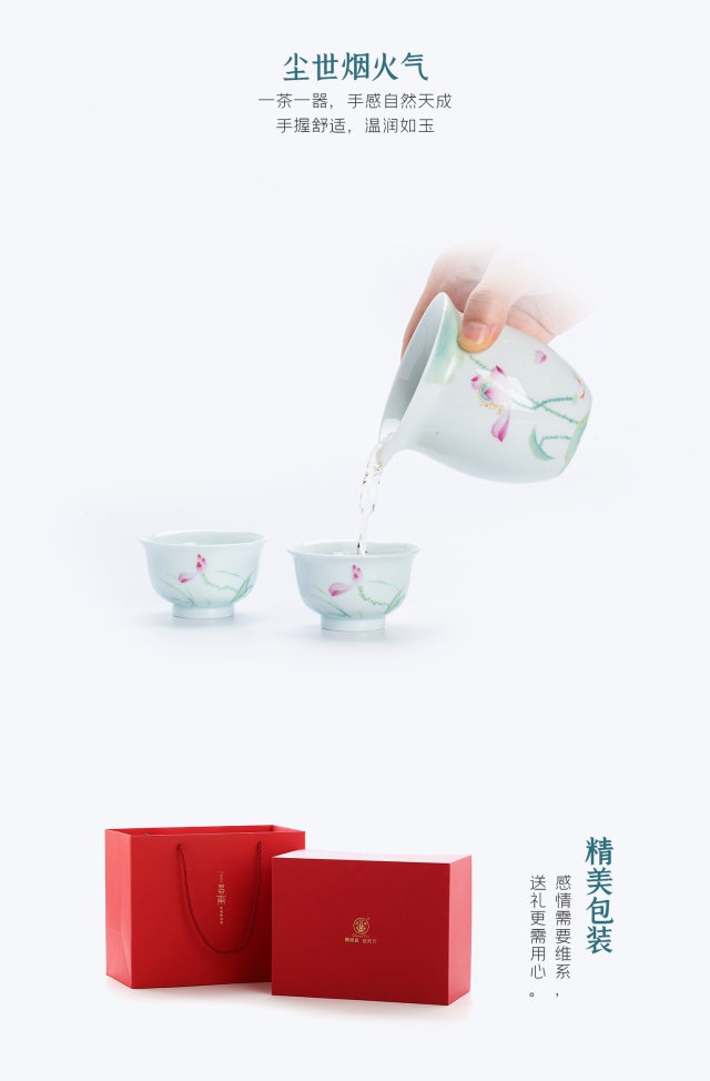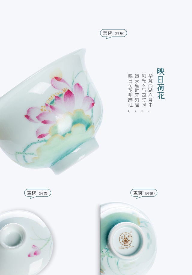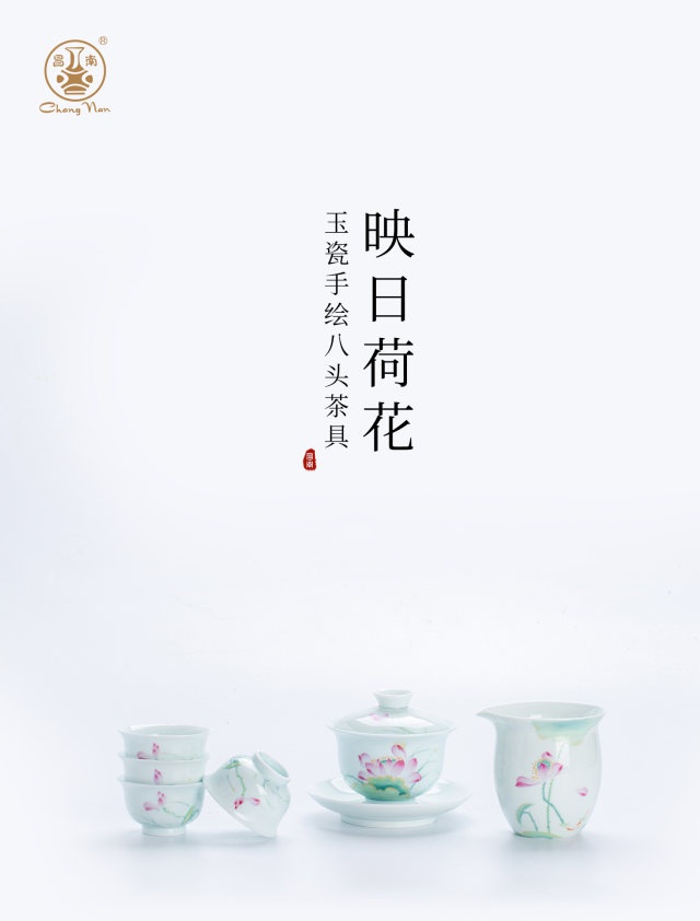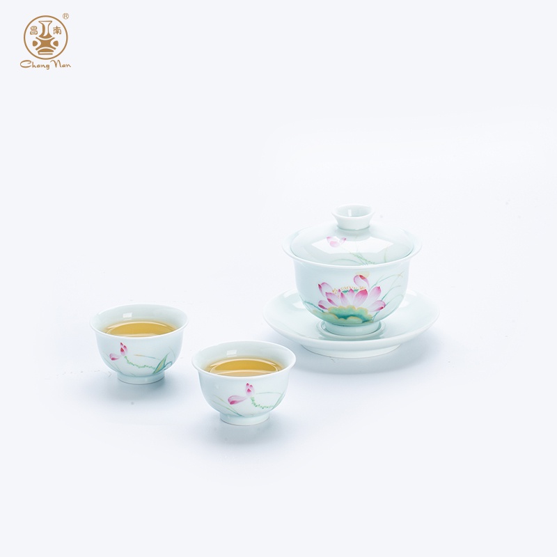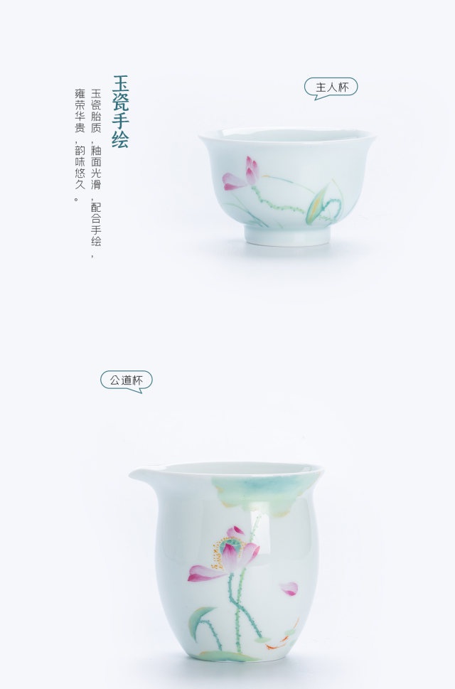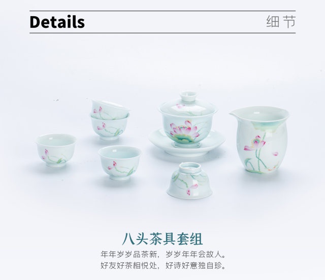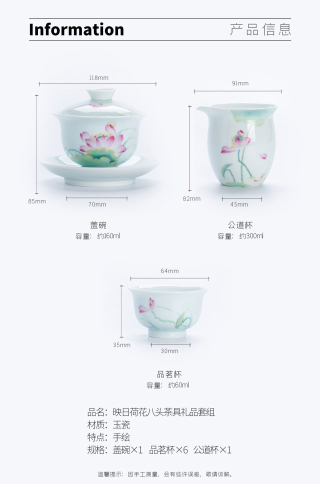 玉瓷手繪“映日荷花”8頭蓋碗茶具套裝